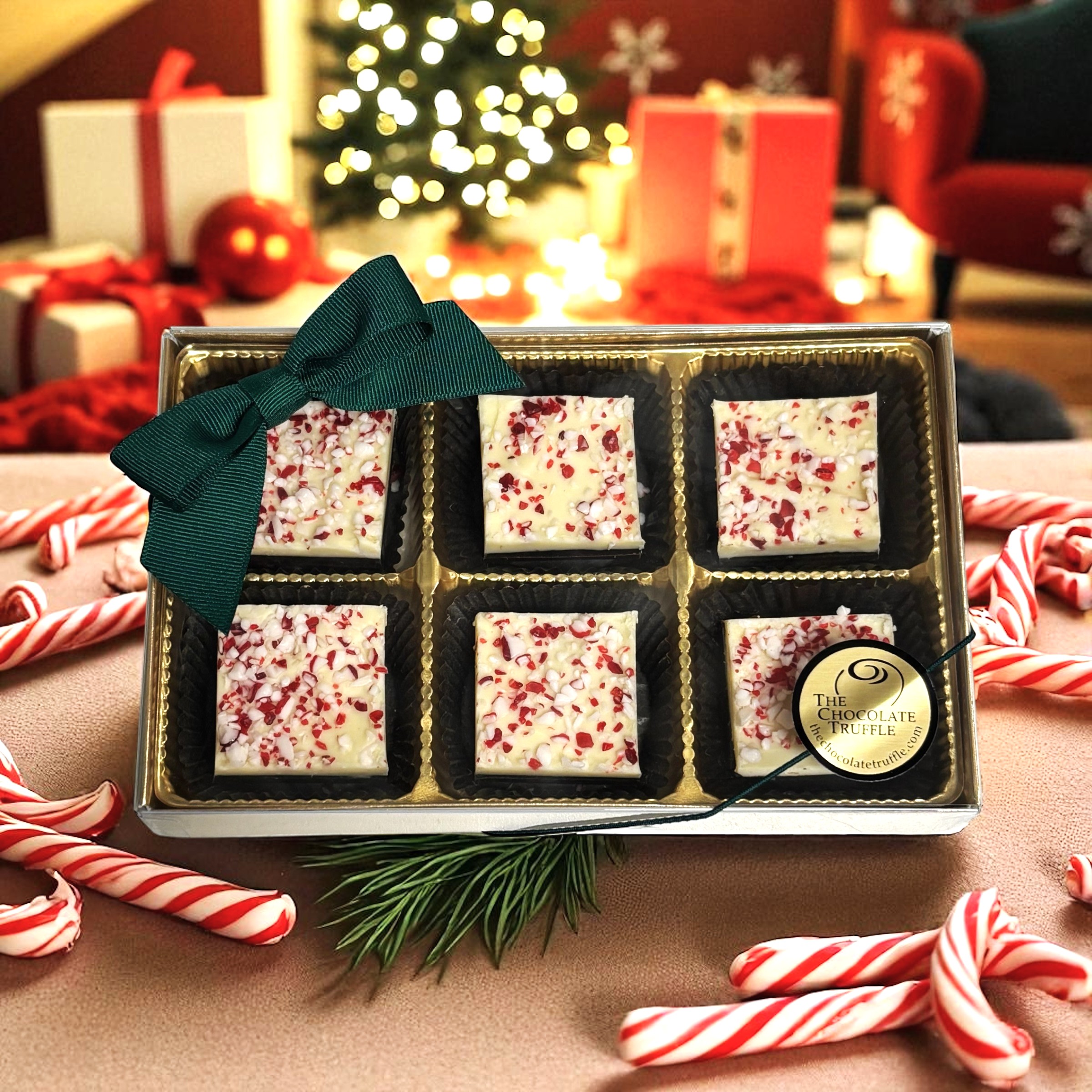 6 pieces of our spectacular version of this holiday delight. A layer of our premium dark chocolate, covered with our sweet white chocolate, flavored only using the highest quality pure peppermint oil, and to finish it off we cover it with crushed peppermint candy cane. What more can we say.